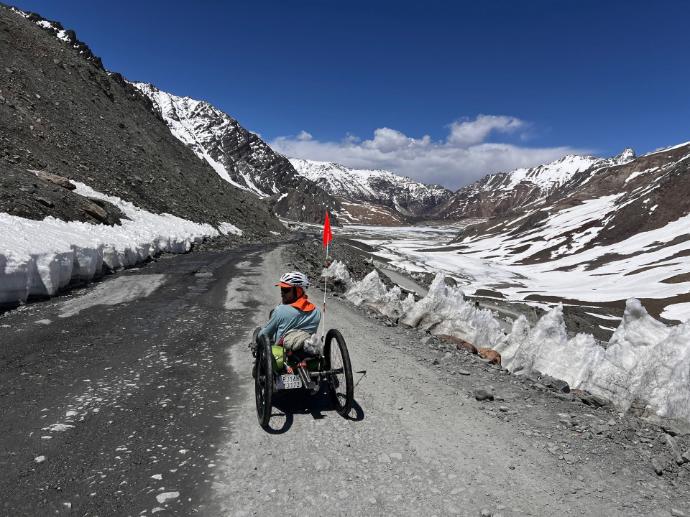 Michiel fietste over de hoogst berijdbare pas met zijn handbike.