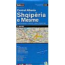 Geplastificeerde wegenkaart van het midden van Albanië. De kaart bevat het volledige wegennetwerk, belangrijke toeristische bezienswaardigheden en een index met plaatsnamen.