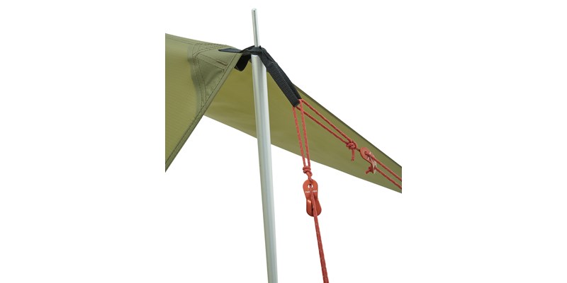 Door het zeildoek 100% oogvrij te ontwerpen, zijn de potentiële zwakke punten in de constructie verwijderd en meerdere pitching-opties vervangen, waaronder aangewezen zeilstokken, wandelstokken, scheerlijnen of zelfs stokken die op de grond zijn gevonden.
